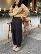De Cosy Volume Pant is een uniek statementstuk dat comfort en stijl op creatieve wijze combineert. Met een wijde, bolvormige pasvorm en zachte wolachtige textuur biedt deze broek een relaxte uitstraling met een edgy randje. De hoge taille en elastische boorden zorgen voor een flatterende en comfortabele fit – ideaal voor modebewuste dagen in de stad.