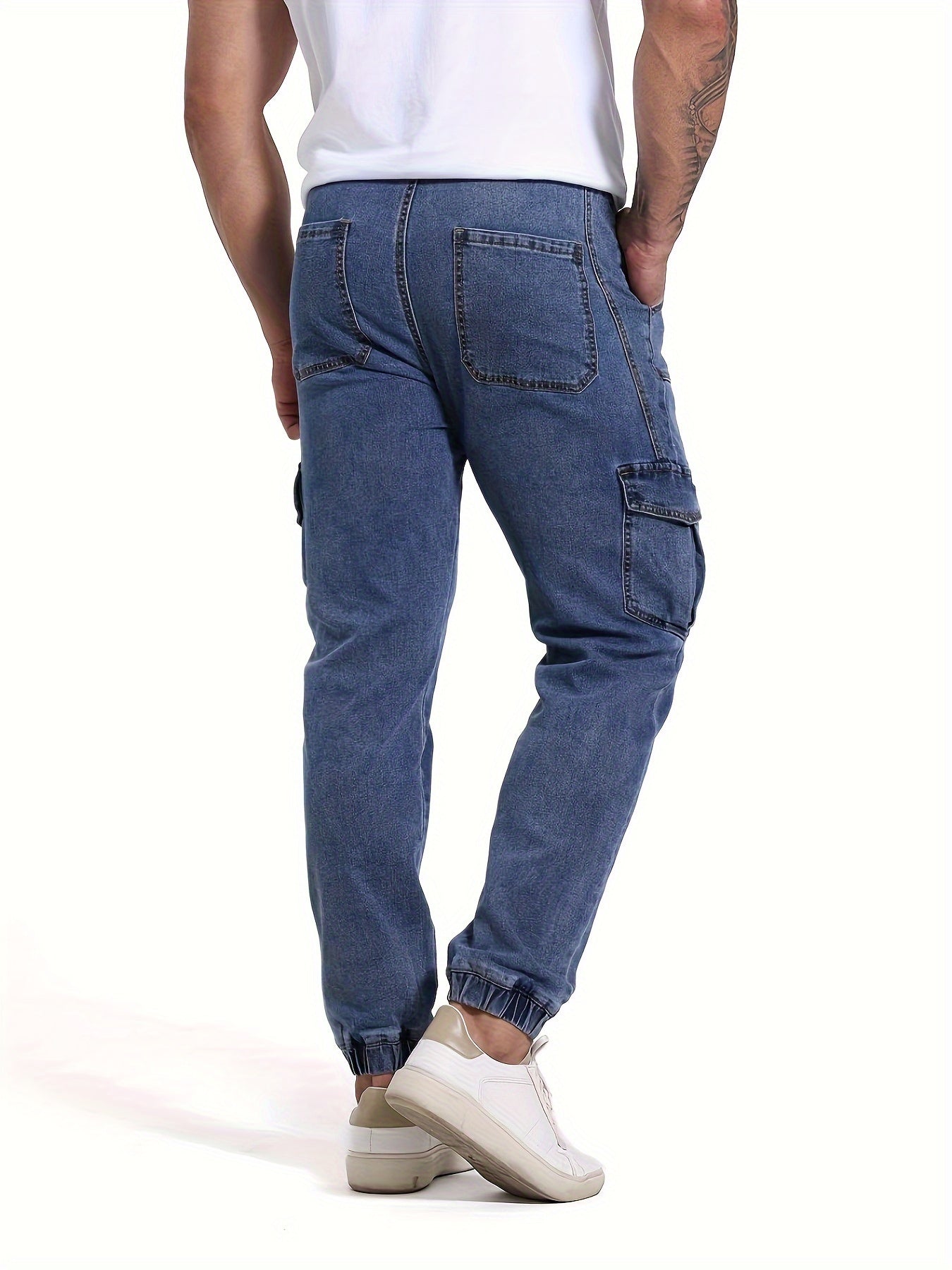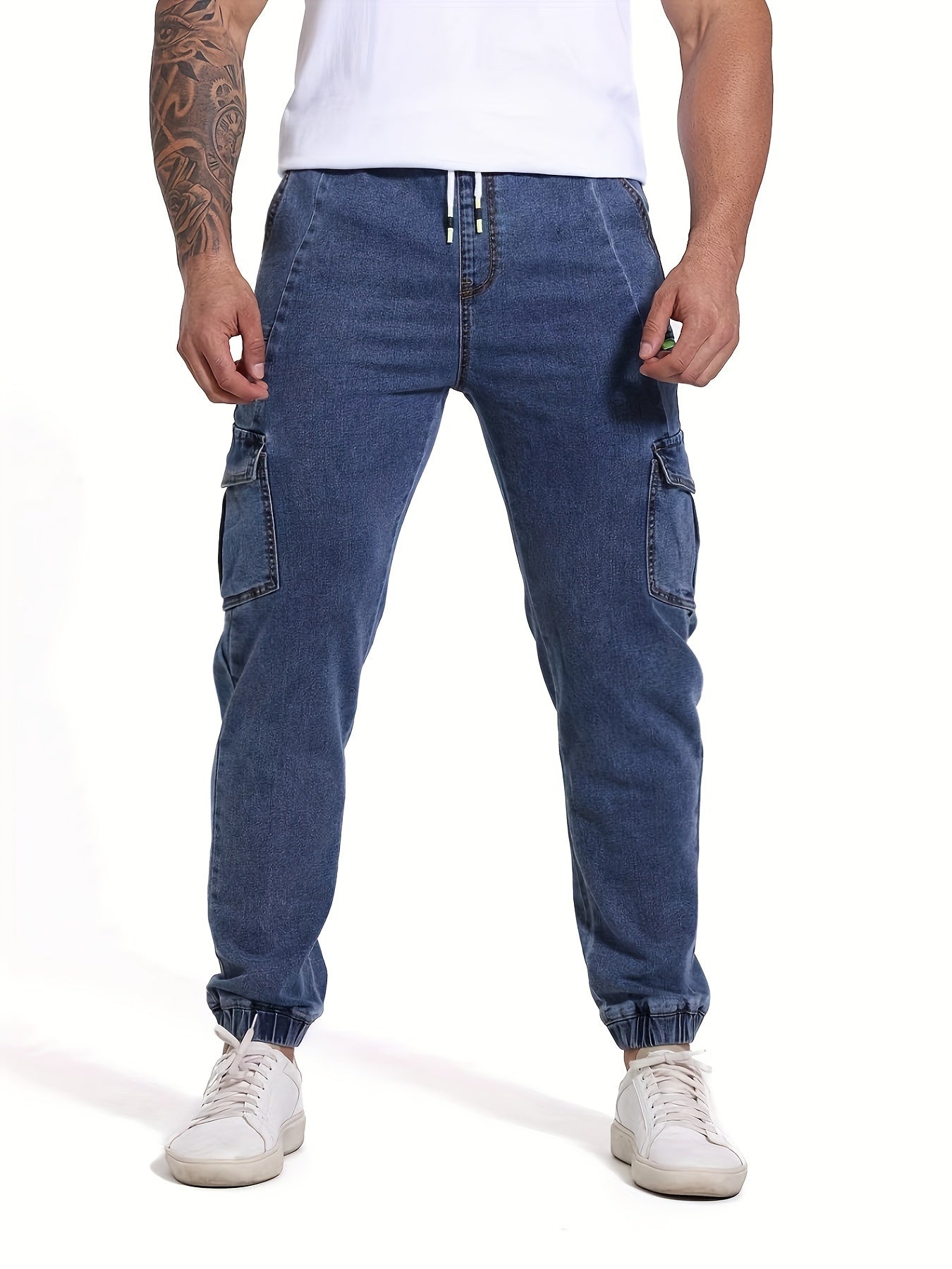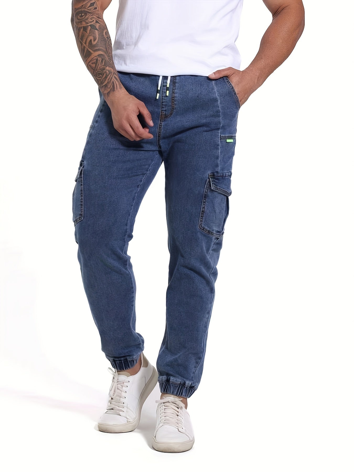 Deze heren cargo jeans combineert het beste van twee werelden: het stoere karakter van denim met het comfort van joggers. De elastische tailleband met trekkoord zorgt voor een perfecte fit, terwijl de cargozakken niet alleen stijlvol zijn, maar ook superpraktisch. Ideaal voor een actieve lifestyle, maar net zo geschikt voor een laid-back weekendoutfit. De tapered fit en elastische enkelboorden geven een moderne, street-ready uitstraling.