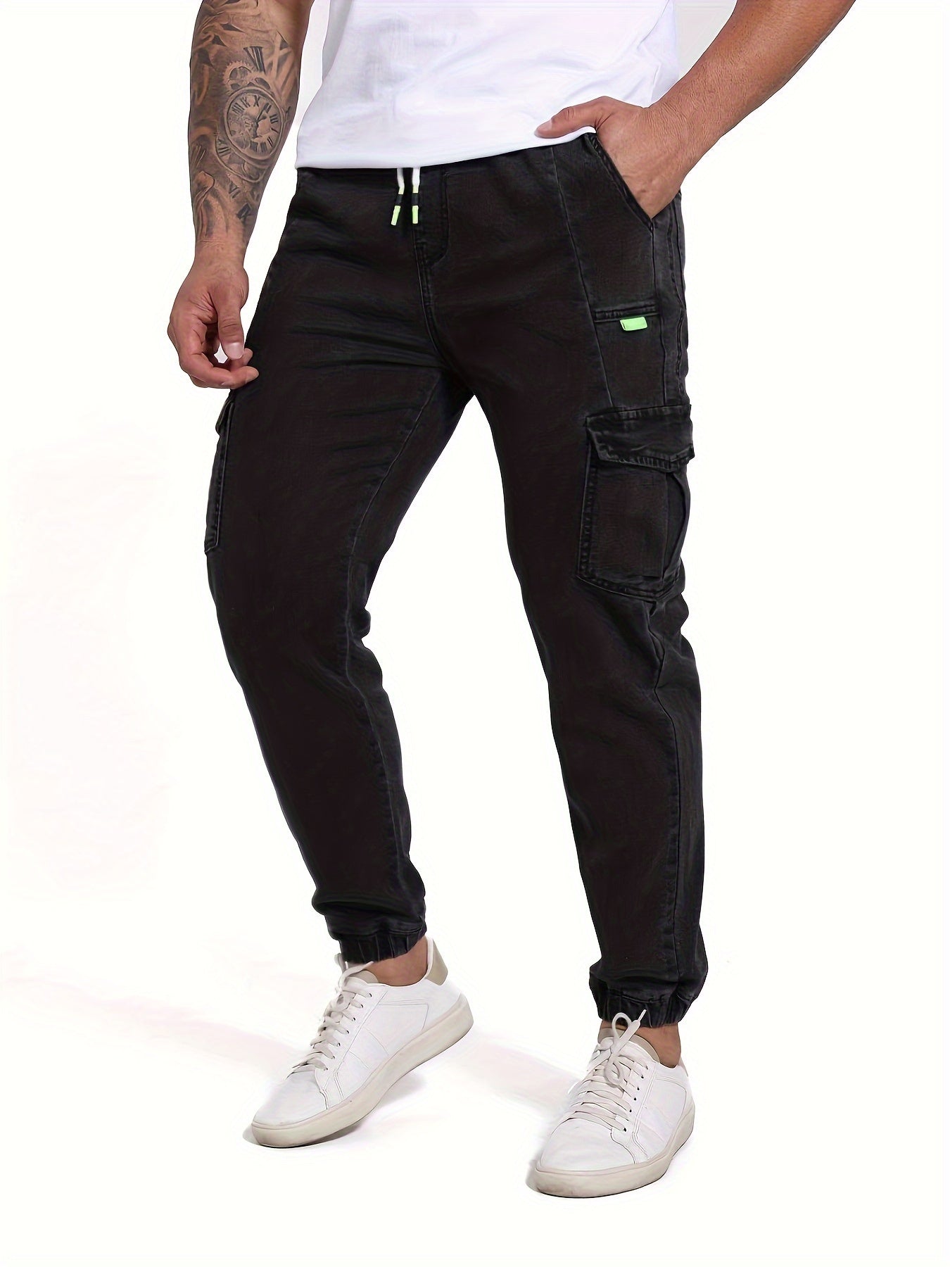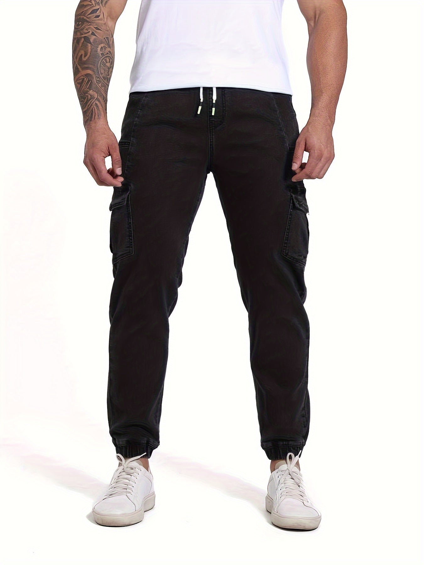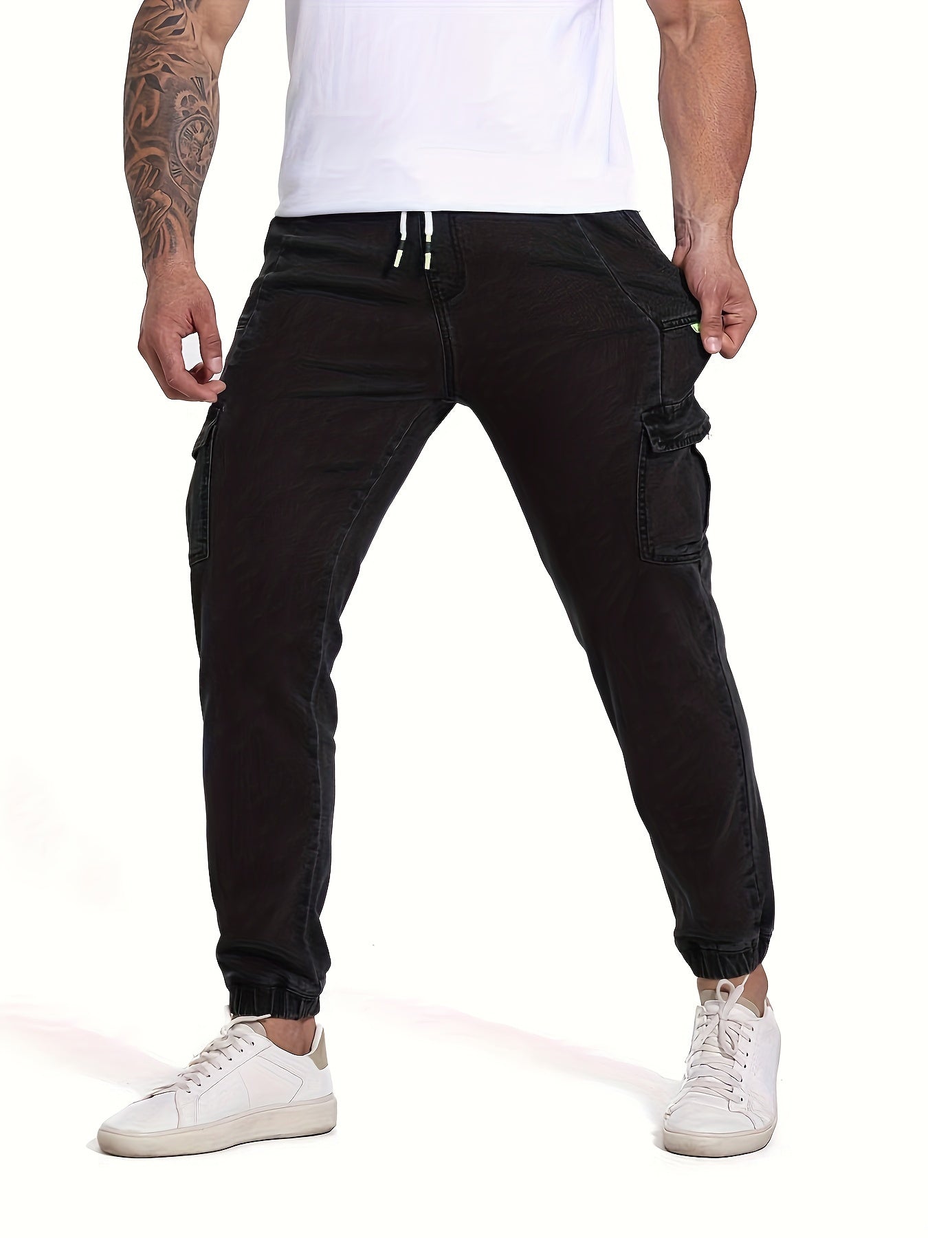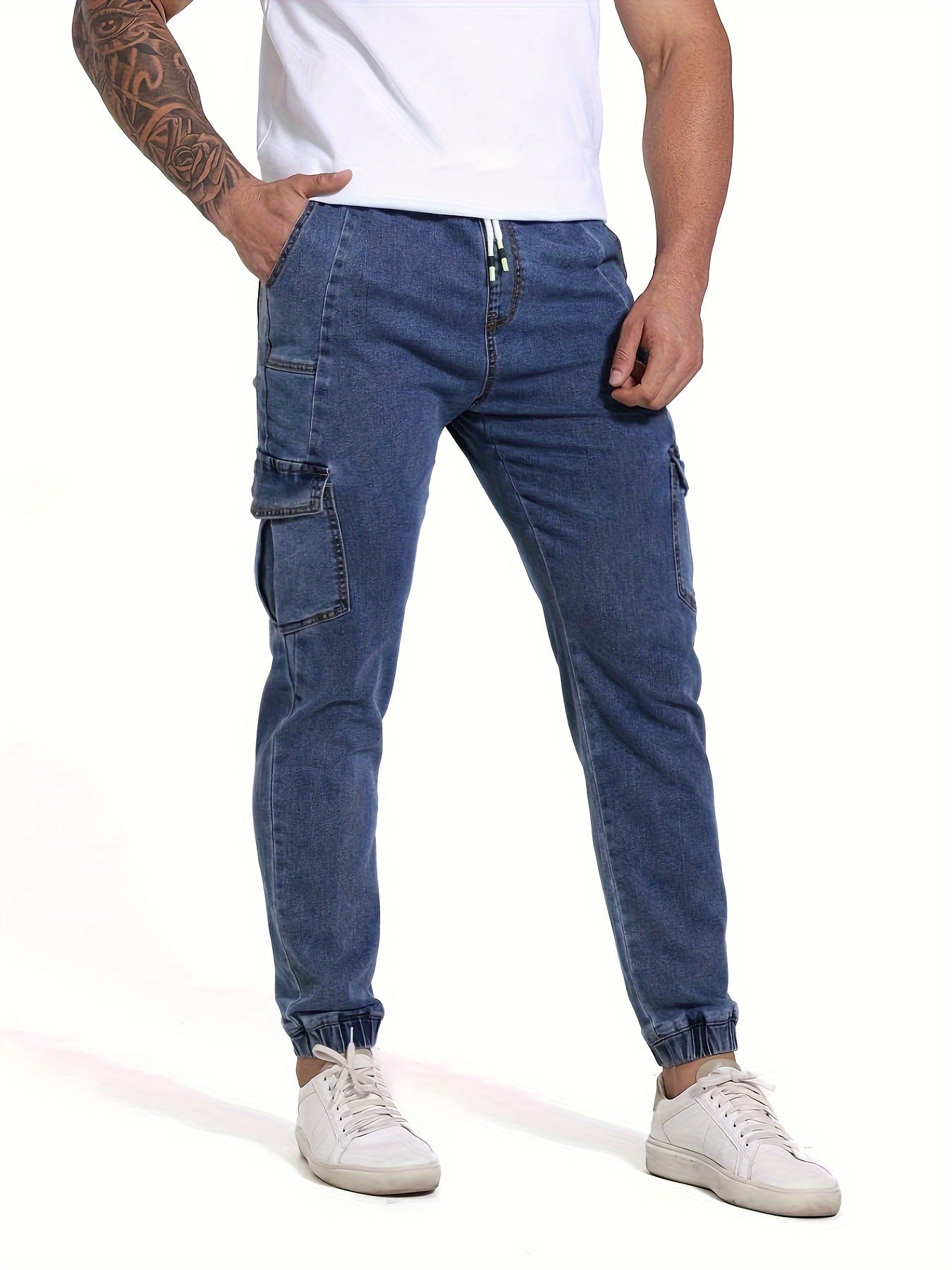 Deze heren cargo jeans combineert het beste van twee werelden: het stoere karakter van denim met het comfort van joggers. De elastische tailleband met trekkoord zorgt voor een perfecte fit, terwijl de cargozakken niet alleen stijlvol zijn, maar ook superpraktisch. Ideaal voor een actieve lifestyle, maar net zo geschikt voor een laid-back weekendoutfit. De tapered fit en elastische enkelboorden geven een moderne, street-ready uitstraling.