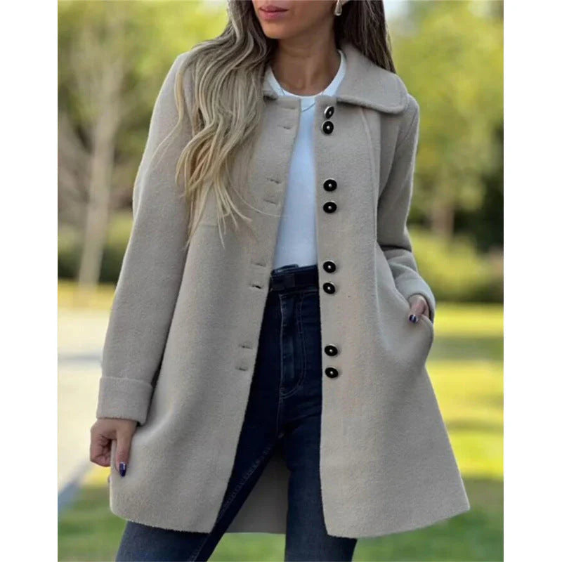 Draag de Classic Button Coat over een coltrui en high-waisted jeans met enkellaarsjes voor een charmante, vrouwelijke look. Perfect voor werk, wandelingen of een gezellige koffiedate.