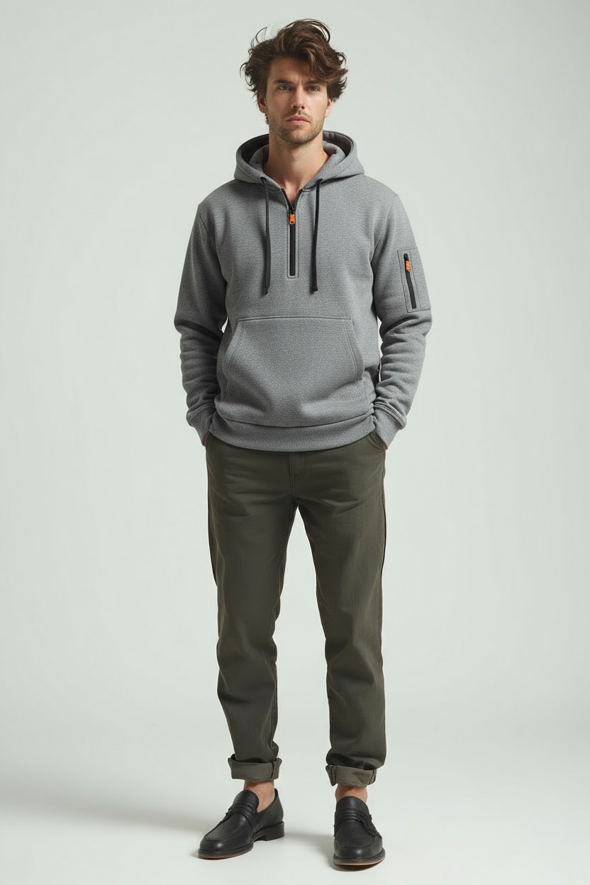 Draag Giovanni met een comfortabele broek en nette schoenen voor een verzorgde, ontspannen uitstraling. Een jas met capuchon die moeiteloos een vaste plek krijgt in je dagelijkse garderobe.