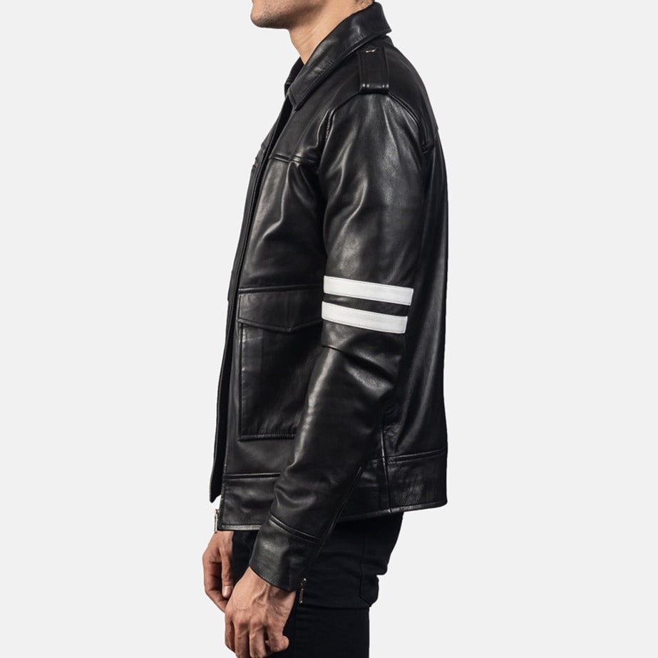 Deze herenjas van kunstleer is uitgevoerd met dubbele witte strepen op beide mouwen voor een dynamisch, opvallend effect. De epauletten op de schouders en de borstzak met rits versterken de biker vibe. Dankzij de rechte ritssluiting, praktische zakken en comfortabele pasvorm is deze jas perfect voor dagelijks gebruik met een stoere twist.