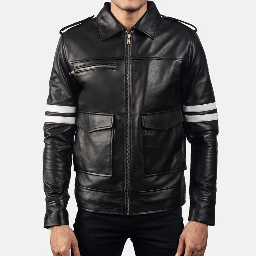 • Design: Witte mouwstrepen, schouderepauletten, bikerstijl elementen