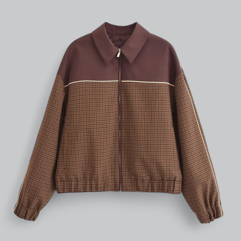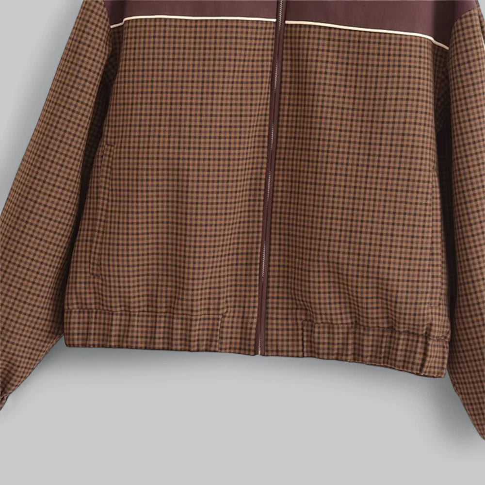 Dit jack combineert een klassieke geruite onderzijde met een effen donkerbruin schouderpaneel, afgewerkt met een witte contrastbies voor extra stijl. De relaxte pasvorm, ritssluiting en elastische boorden zorgen voor optimaal draagcomfort. Of je nu voor een vintage look gaat of je dagelijkse streetwear wilt upgraden – dit jack doet het allemaal.