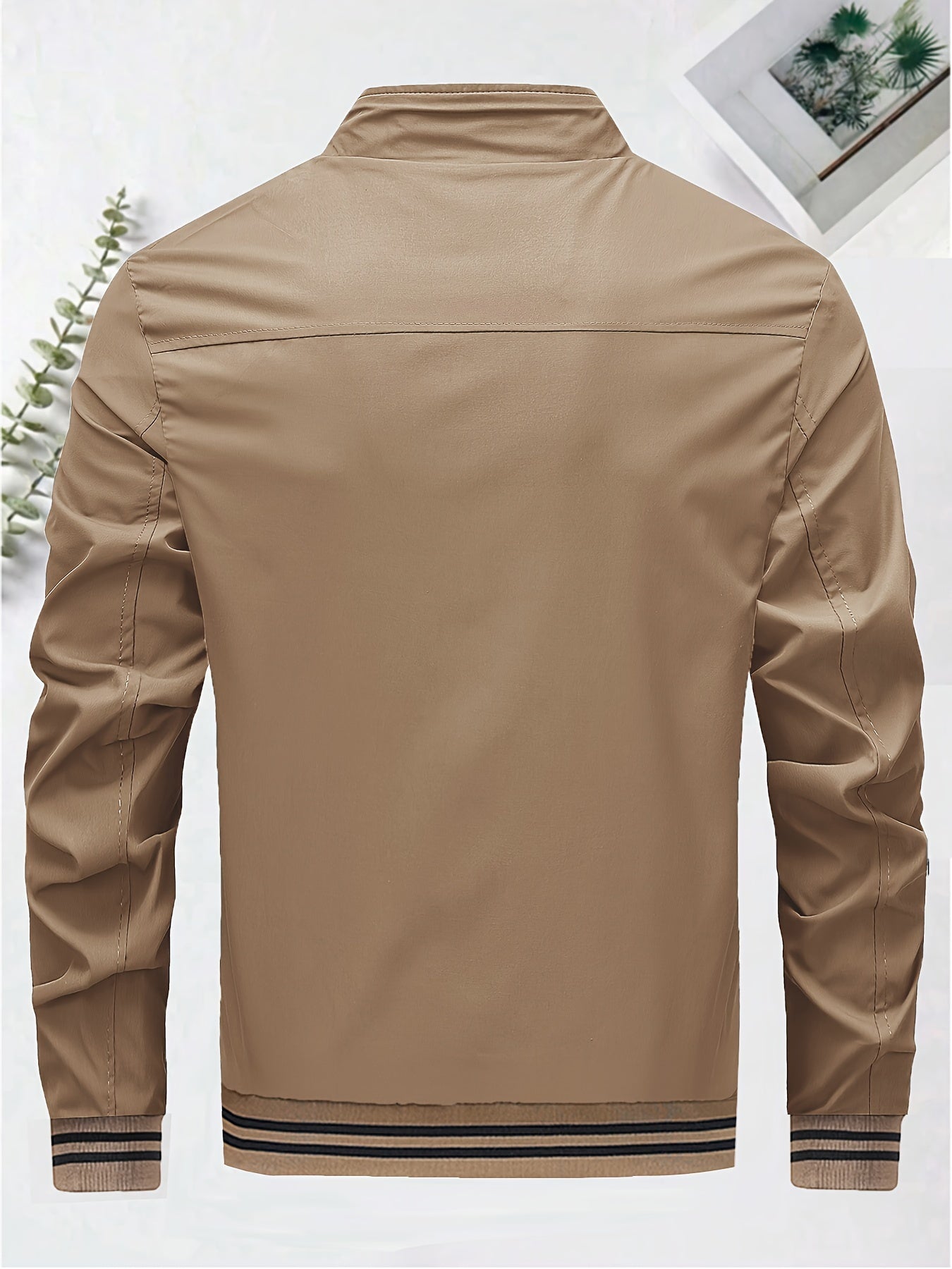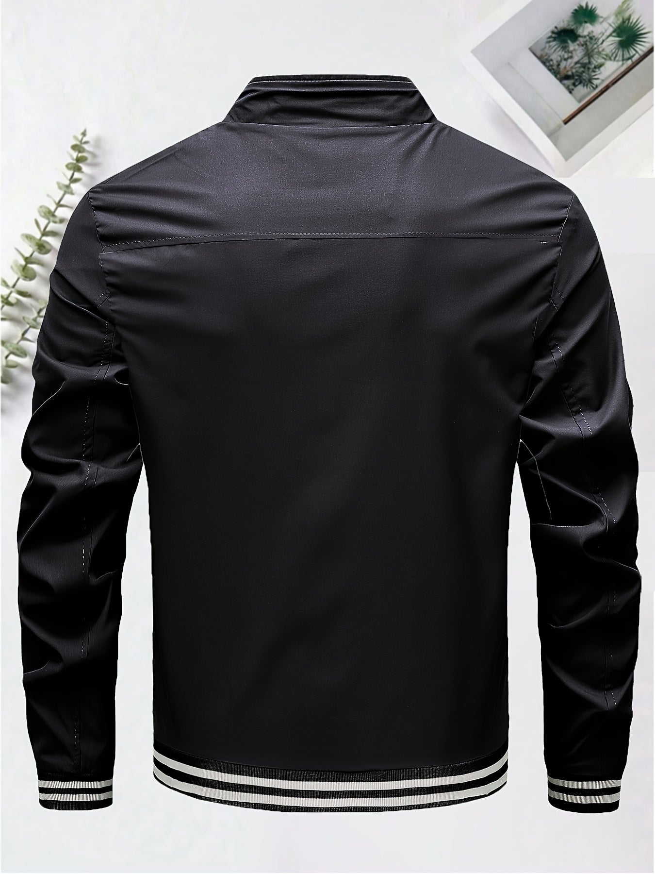 Dit lichtgewicht bomberjack combineert een moderne uitstraling met functionele details. De opstaande kraag, gestreepte boorden en ritssluiting geven het een sportieve en tijdloze uitstraling. Dankzij de comfortabele pasvorm en het ademende materiaal is het ideaal voor dagelijks gebruik, of je nu een casual outfit compleet wilt maken of een extra laagje nodig hebt op frisse dagen.