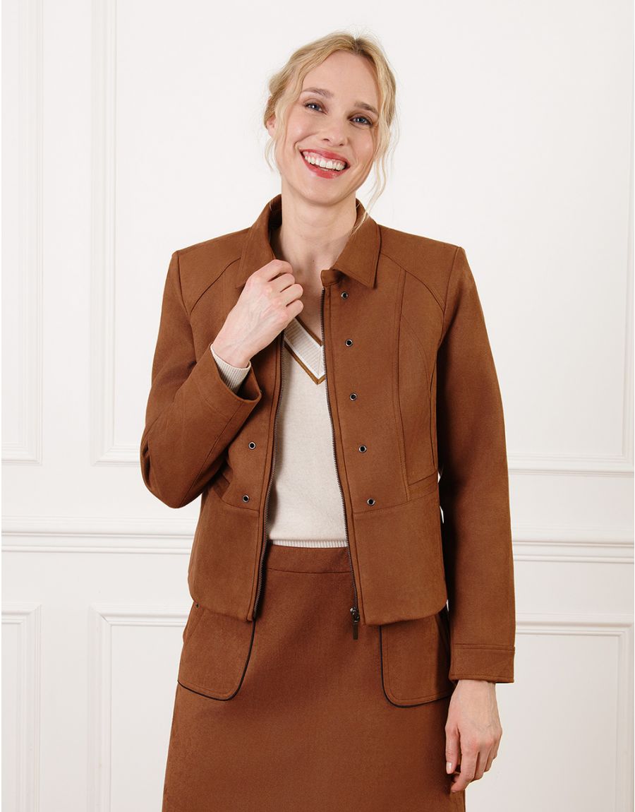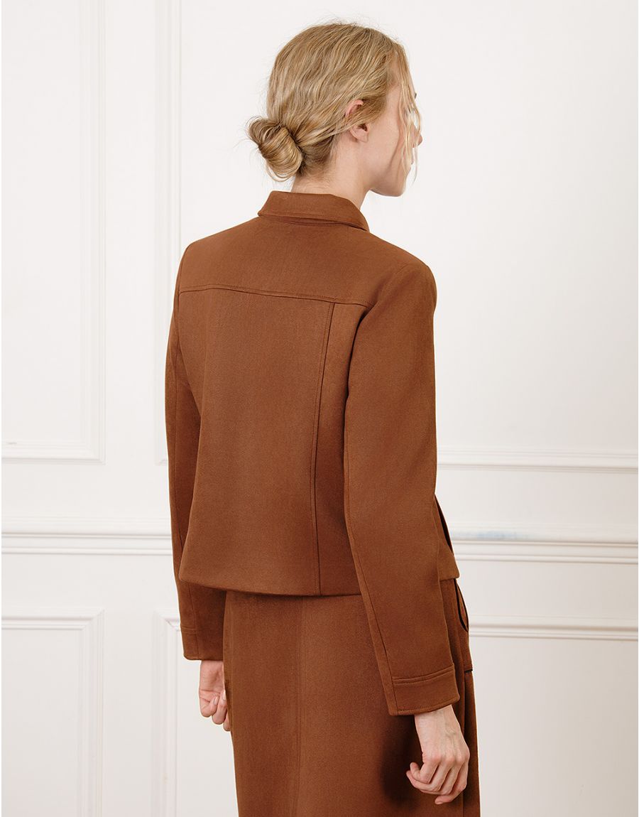 • Pasvorm: Kort, licht getailleerd model met schouderaccent