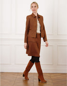De Heritage Chic Blazer ademt klassieke elegantie met een moderne twist. De gestructureerde snit, rijke cognackleur en verfijnde details maken deze blazer tot een veelzijdig item voor stijlvolle dagen. Perfect in combinatie met de bijpassende rok of als los jasje voor een smart-casual uitstraling.