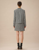 De Houndstooth Blazer is een elegant statementstuk dat klassieke charme combineert met moderne verfijning. Het iconische zwart-witte pied-de-poulepatroon straalt klasse uit, terwijl de rechte snit en gestructureerde schouders zorgen voor een flatterend silhouet. De contrasterende biezen voegen een geraffineerd detail toe dat deze blazer extra bijzonder maakt.