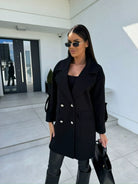 Combineer de Sleek Double-Breasted Coat met een coltrui, faux leather broek en enkellaarsjes voor een krachtige, moderne look. Voeg een structured handtas toe voor een professionele touch. Perfect voor werk, afspraken of een stijlvolle dag onderweg