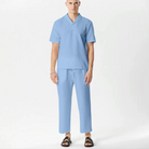 Deze coördinerende set bestaat uit een luchtig kortemouwenoverhemd en een bijpassende broek met elastische tailleband. De soepele stof voelt zacht en koel aan, terwijl de relaxed fit zorgt voor volledige bewegingsvrijheid. Beschikbaar in frisse tinten zoals lichtblauw, wit en zwart, past deze set naadloos in elke zomergarderobe. Ideaal voor een resort-look, stranddag of casual diner op het terras.