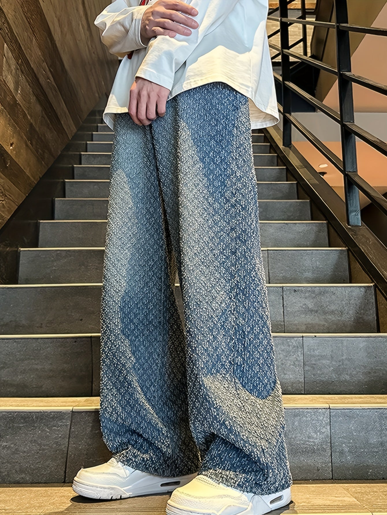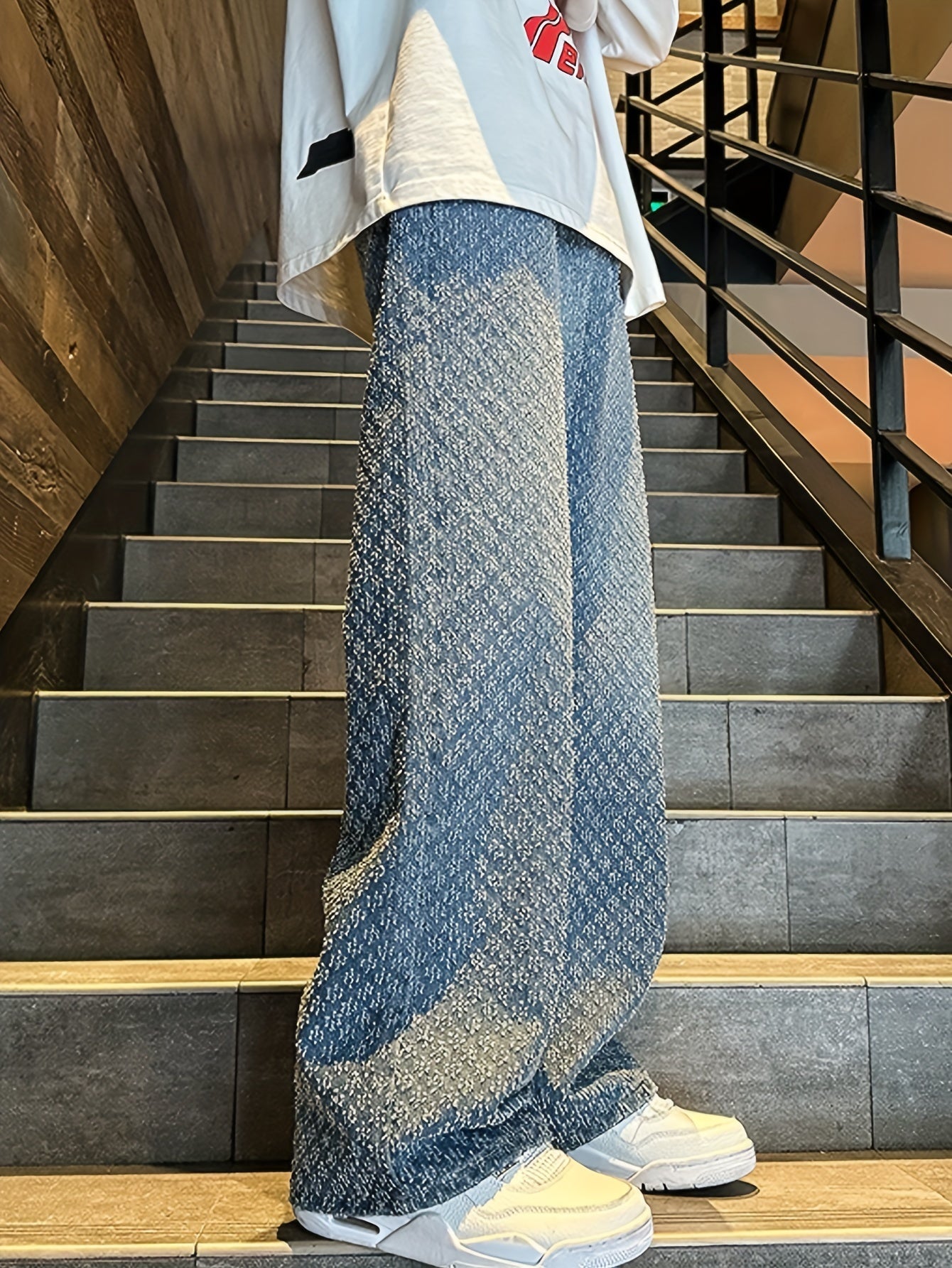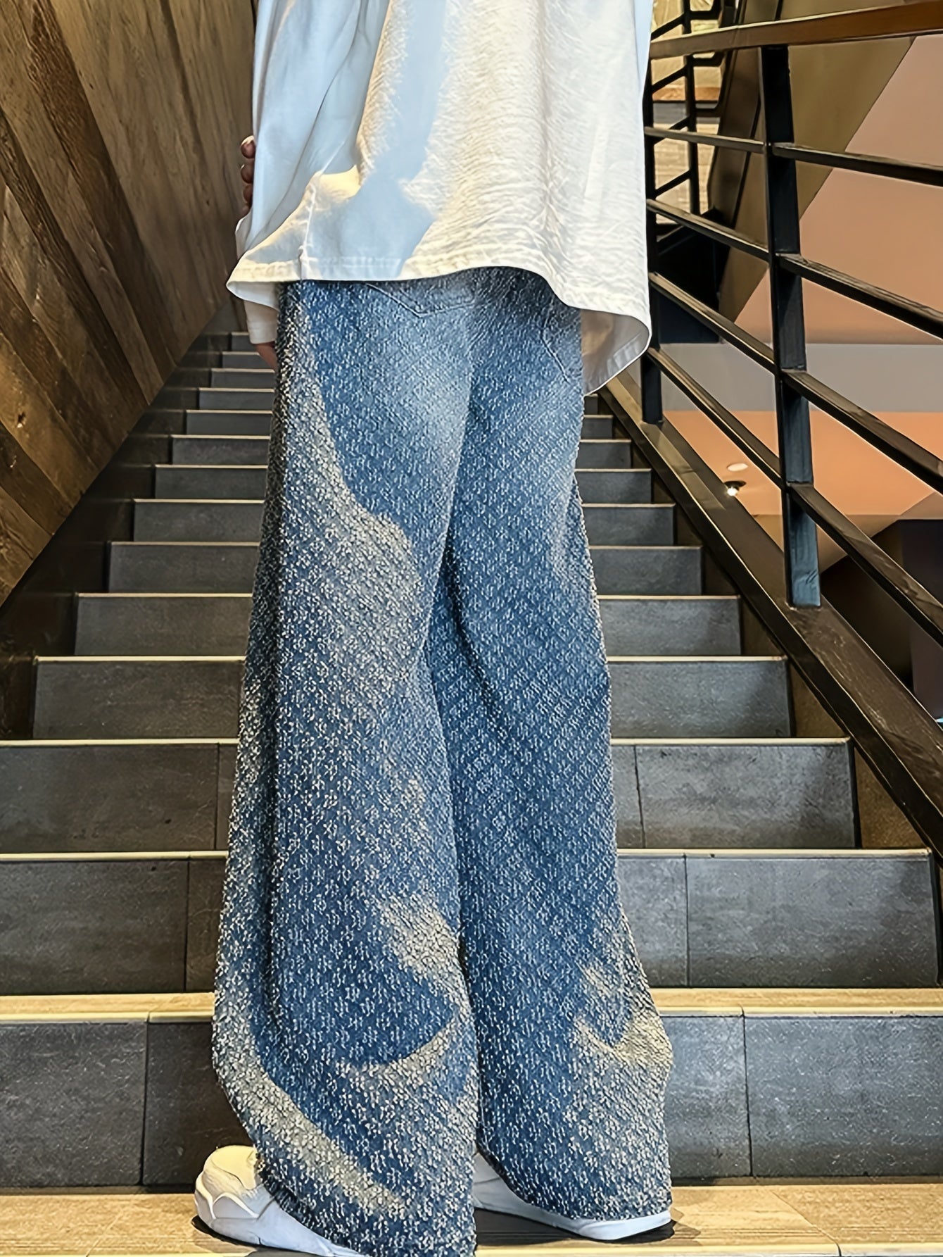 Deze heren wide leg denim broek is een statement piece voor liefhebbers van unieke streetwear. Met een opvallend geweven patroon en een oversized pasvorm combineert deze broek comfort met een stijlvolle, edgy uitstraling. Perfect voor urban fashion en moderne casual outfits.