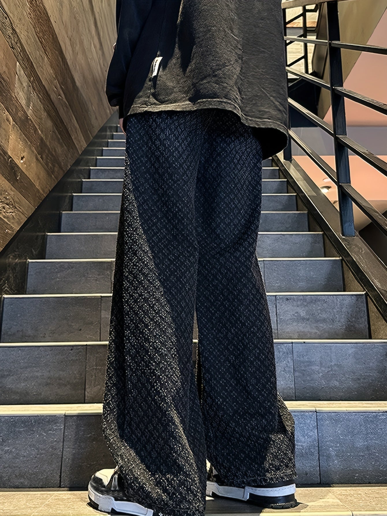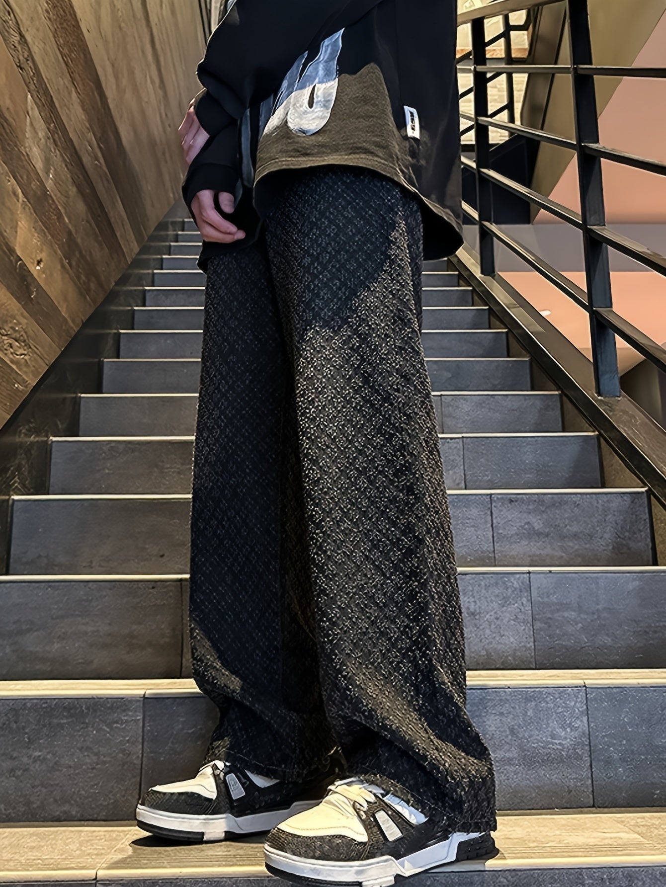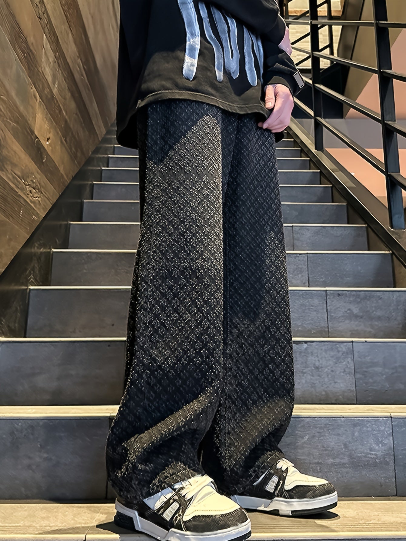 Deze heren wide leg denim broek is een statement piece voor liefhebbers van unieke streetwear. Met een opvallend geweven patroon en een oversized pasvorm combineert deze broek comfort met een stijlvolle, edgy uitstraling. Perfect voor urban fashion en moderne casual outfits.