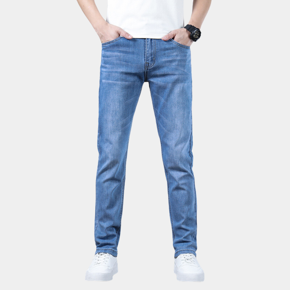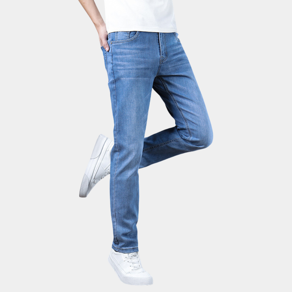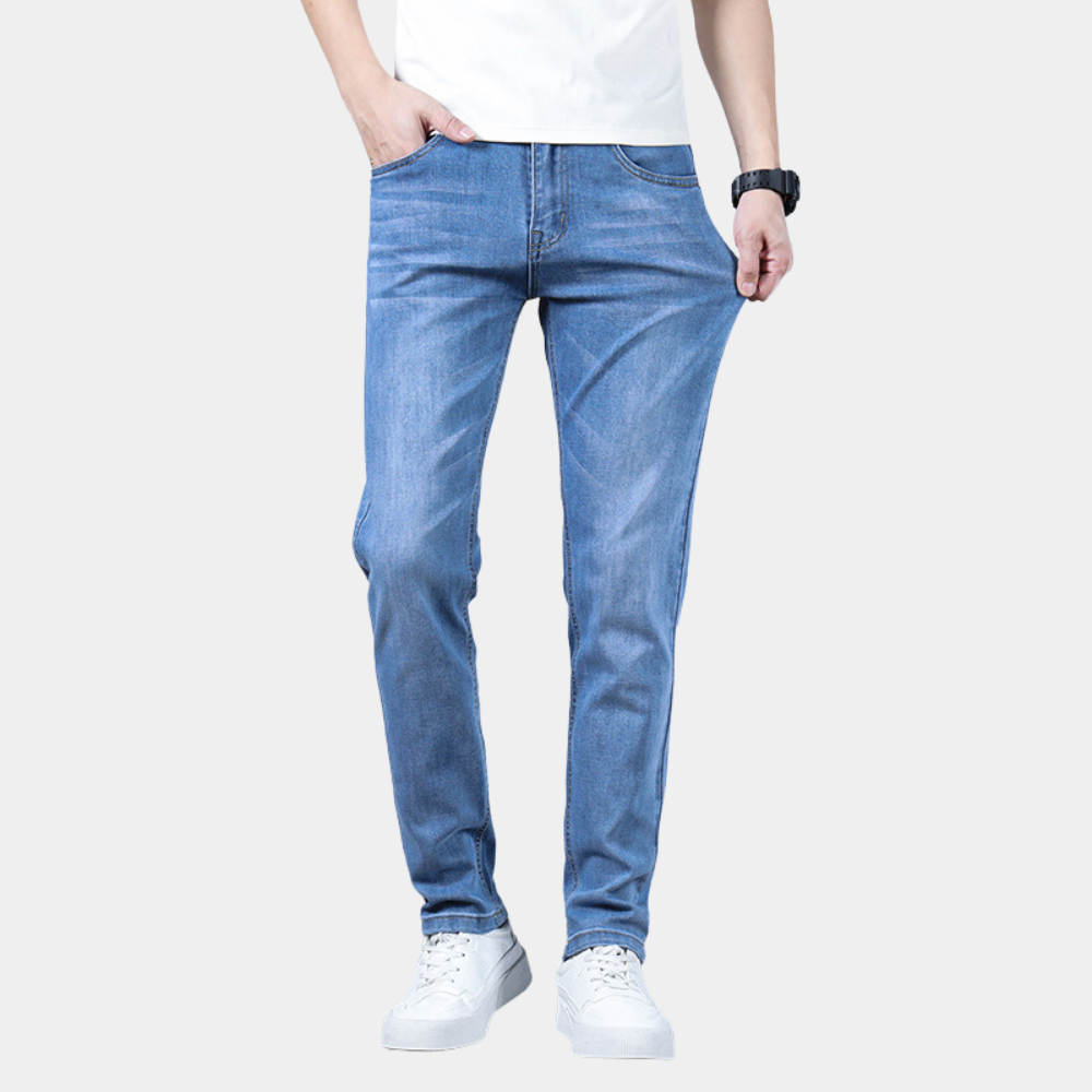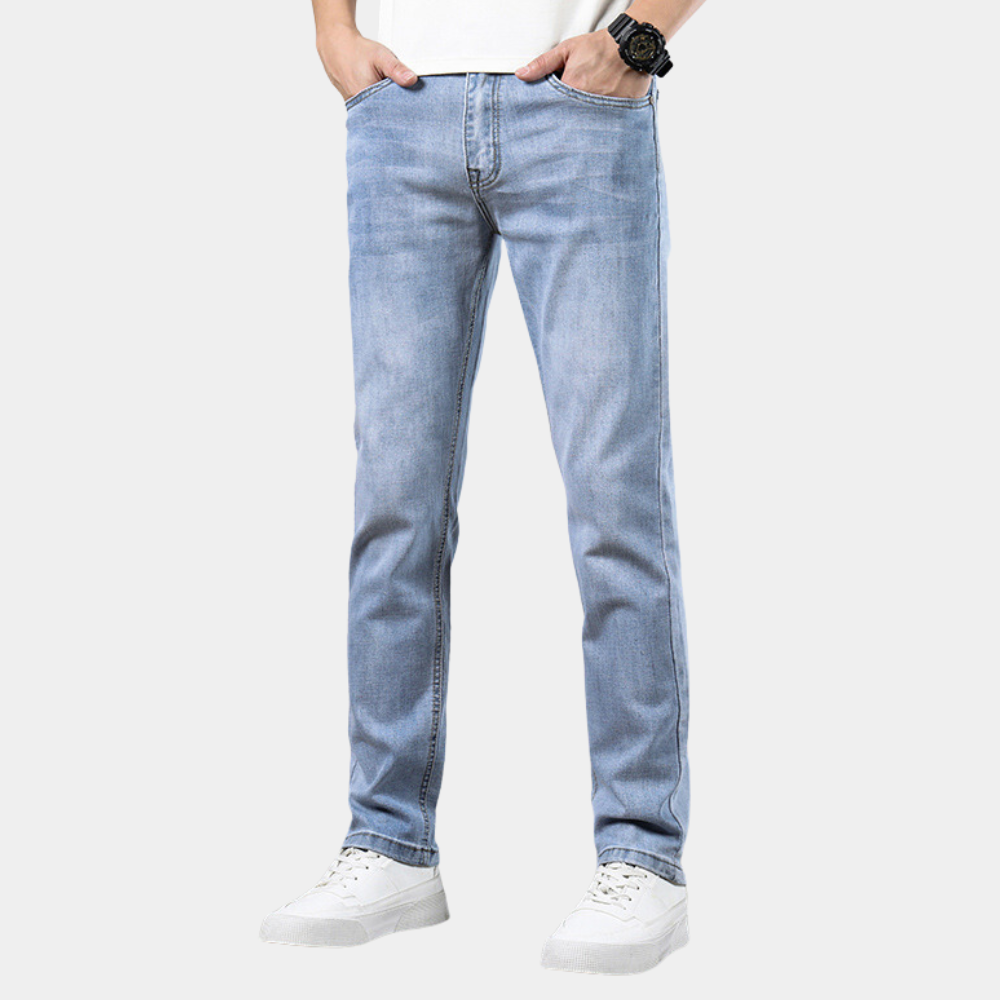 Deze lichtblauwe straight-leg jeans zijn een must-have voor elke garderobe. Gemaakt van hoogwaardig denim bieden ze een comfortabele pasvorm en een tijdloze uitstraling. Ideaal voor casual dagen, werk of een avondje uit, deze jeans zijn een veelzijdige keuze voor elke man.