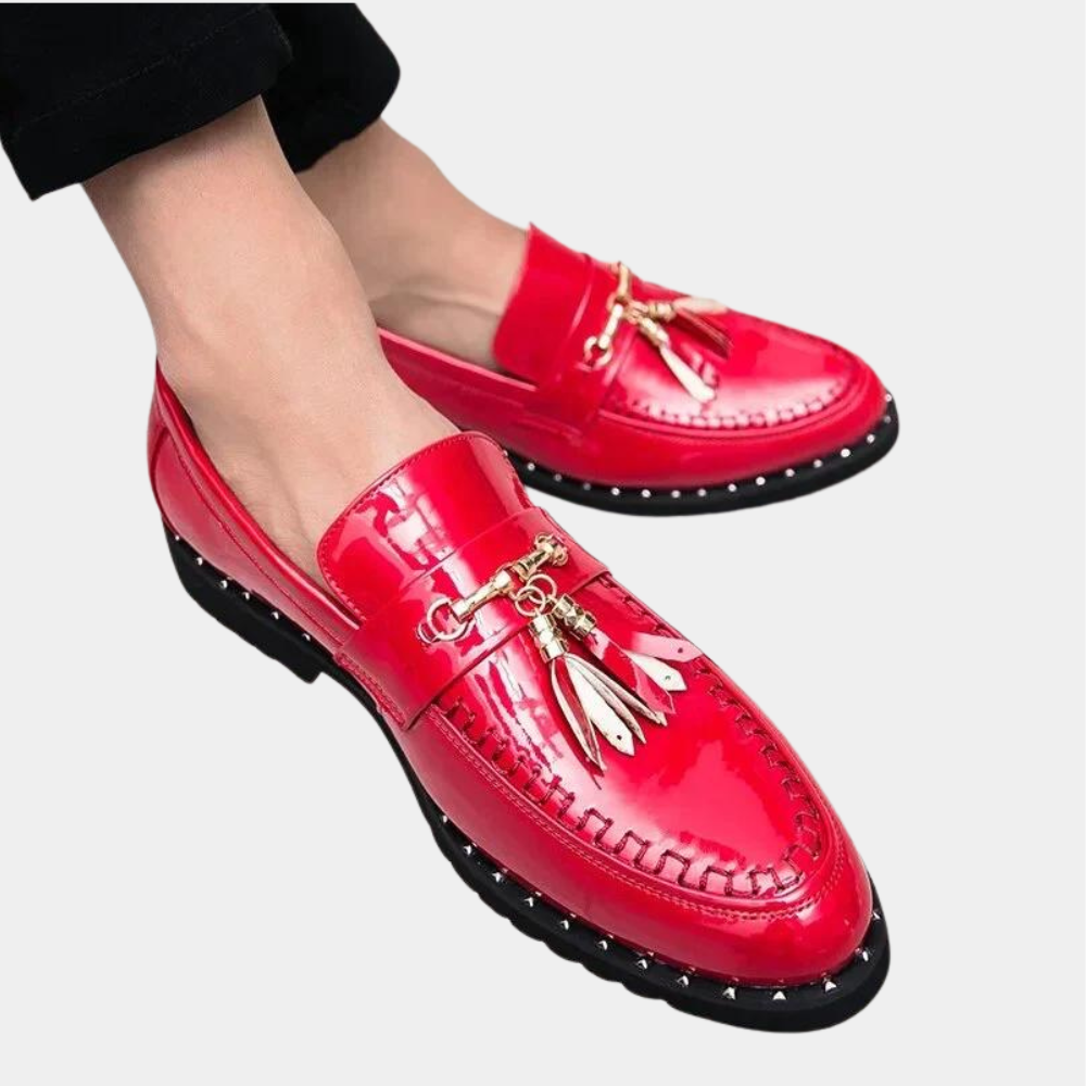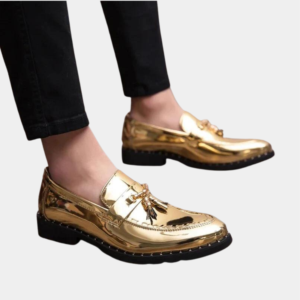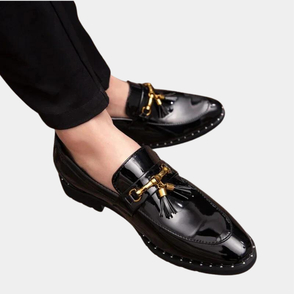 Deze glanzende heren loafers met opvallend metallic detail zijn de perfecte mix van extravagantie en elegantie. Ze zijn ontworpen voor de moderne man die niet bang is om te stralen. De lakafwerking zorgt voor een luxe uitstraling, terwijl het metalen bitdetail en de stevige zool zowel stijl als stevigheid bieden. Verkrijgbaar in drie krachtige kleuren: zwart, goud en rood.