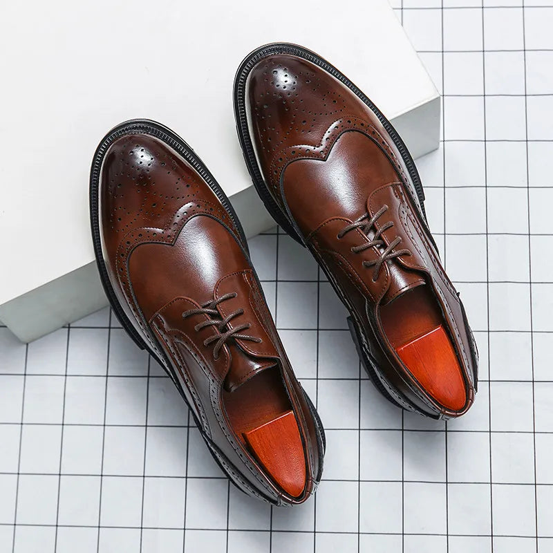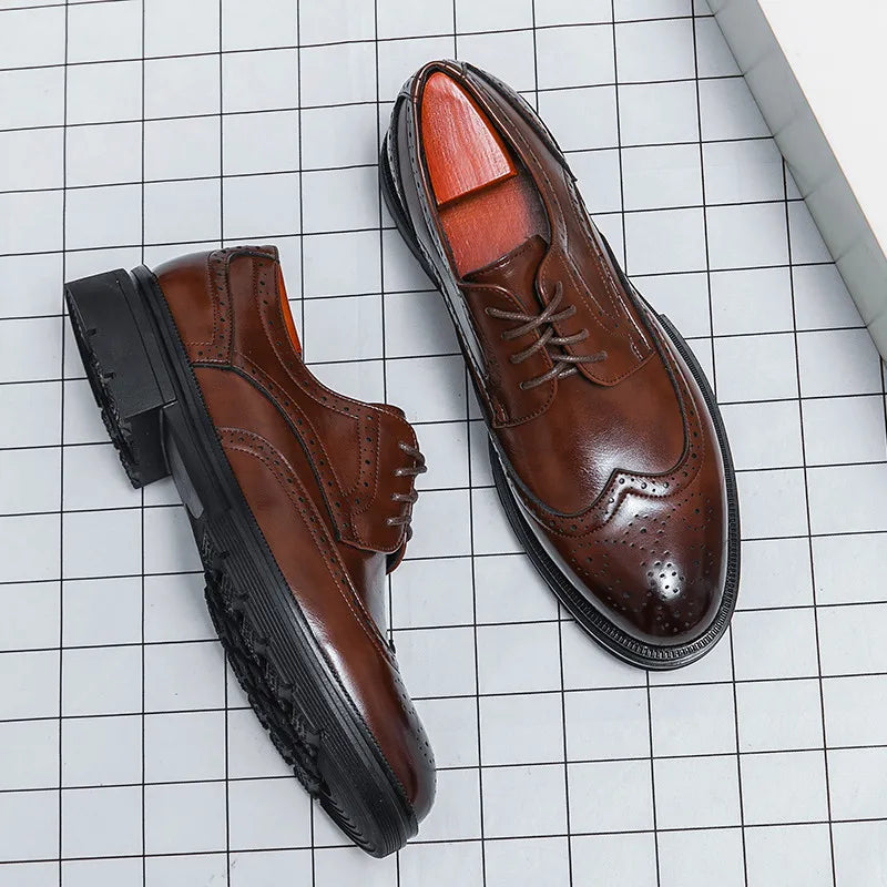 Deze veterschoenen combineren klassiek vakmanschap met een opvallende glansafwerking. Het kenmerkende brogue-patroon geeft de schoen karakter, terwijl de stevige zool met lichte verhoging zorgt voor extra draagcomfort. Verkrijgbaar in diep zwart en rijk bruin – perfect voor formele outfits, werk of chique diners.