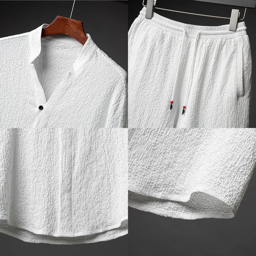 De Kyoto Lounge Set brengt rust en stijl samen in één elegant ontwerp. Met een losse, driekwart-mouw top en een comfortabele broek met elastische taille is deze set perfect voor ontspanning in stijl. De subtiele textuur, minimalistische details en ademende stof maken het een verfijnde keuze voor thuis of casual outings.