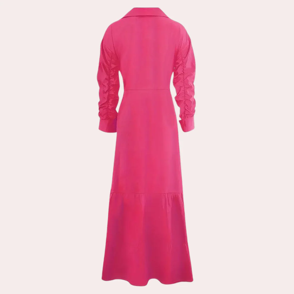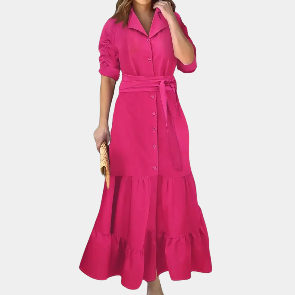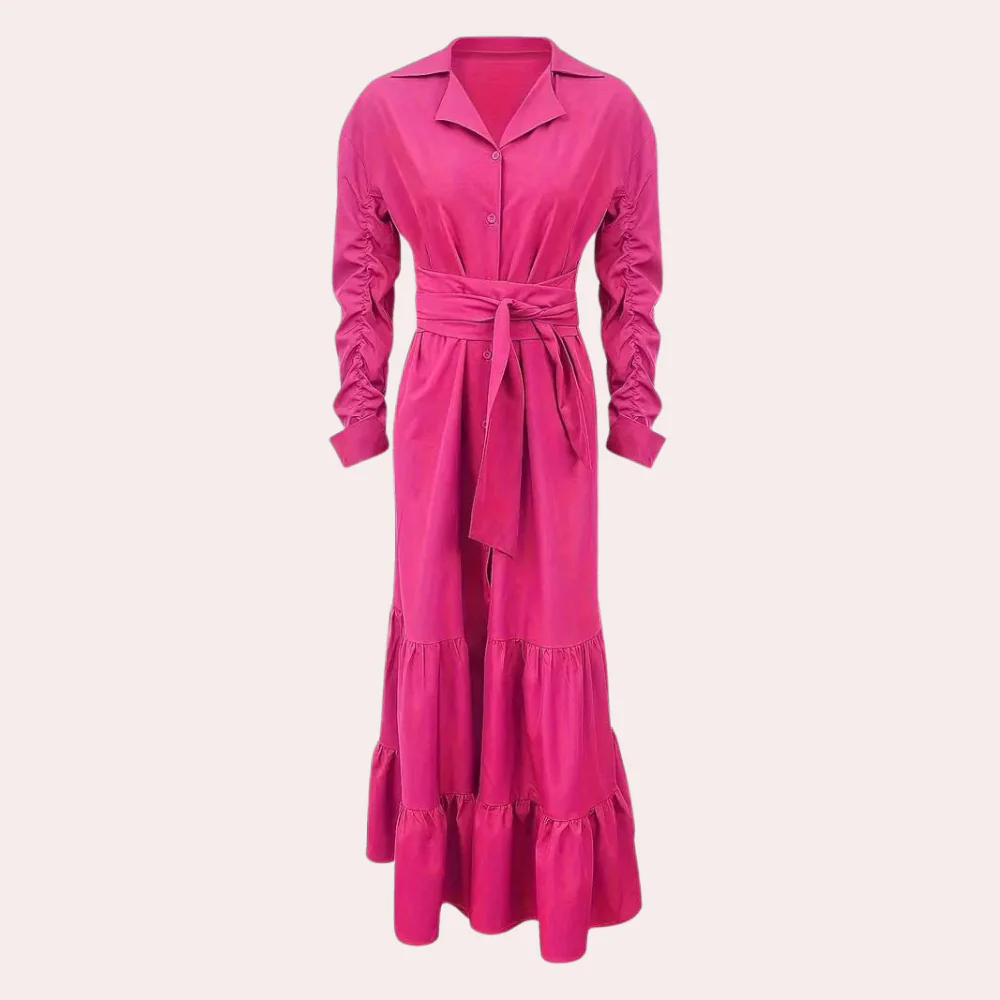 De Camélia Jurk straalt klasse en vrouwelijkheid uit in een tijdloos silhouet. Deze maxi hemdjurk combineert een klassieke overhemdkraag met een elegante knoopsluiting en een bijpassende ceintuur die de taille accentueert. De zwierige rok met subtiele ruches geeft de look een verfijnde touch, terwijl de levendige kleur zorgt voor een opvallend statement.