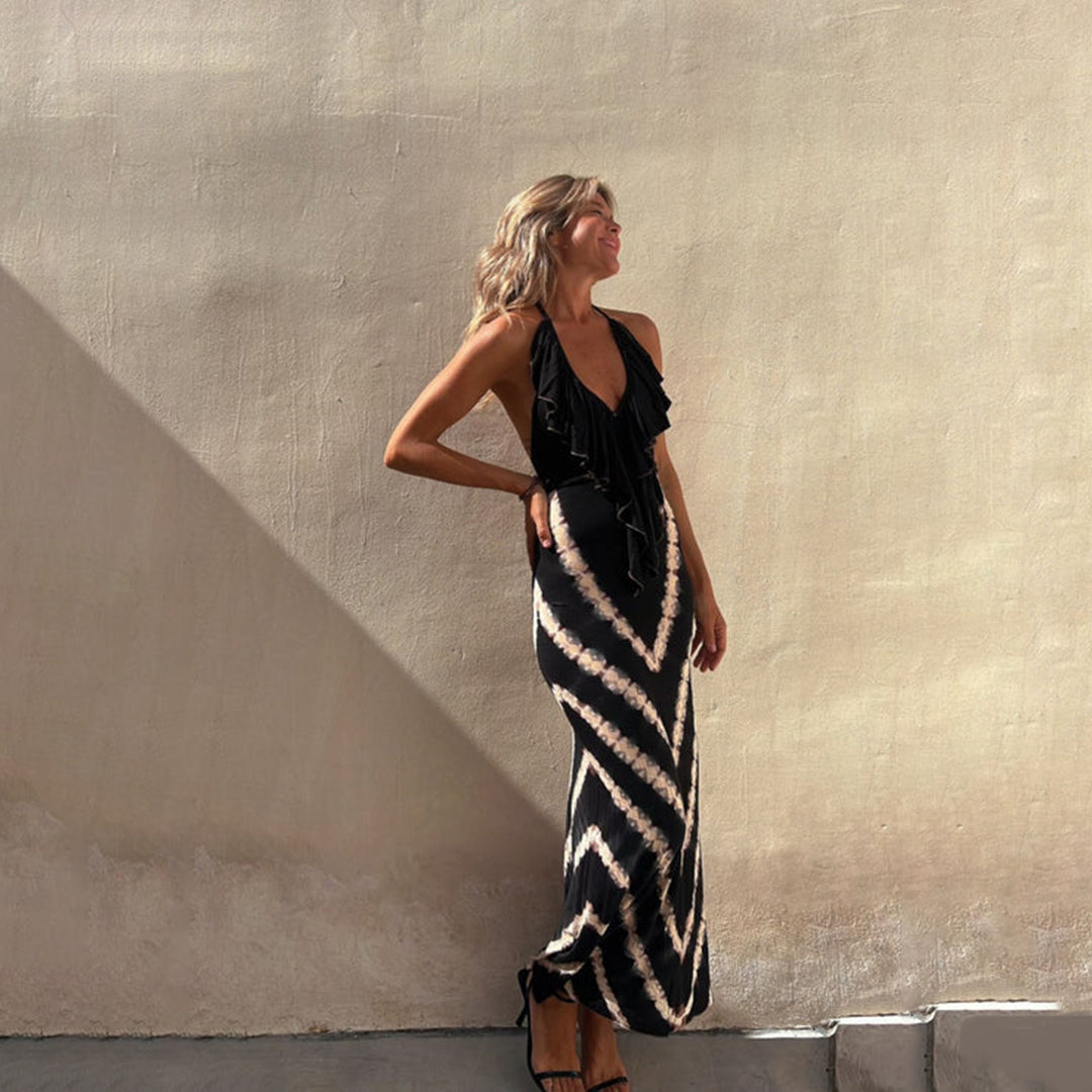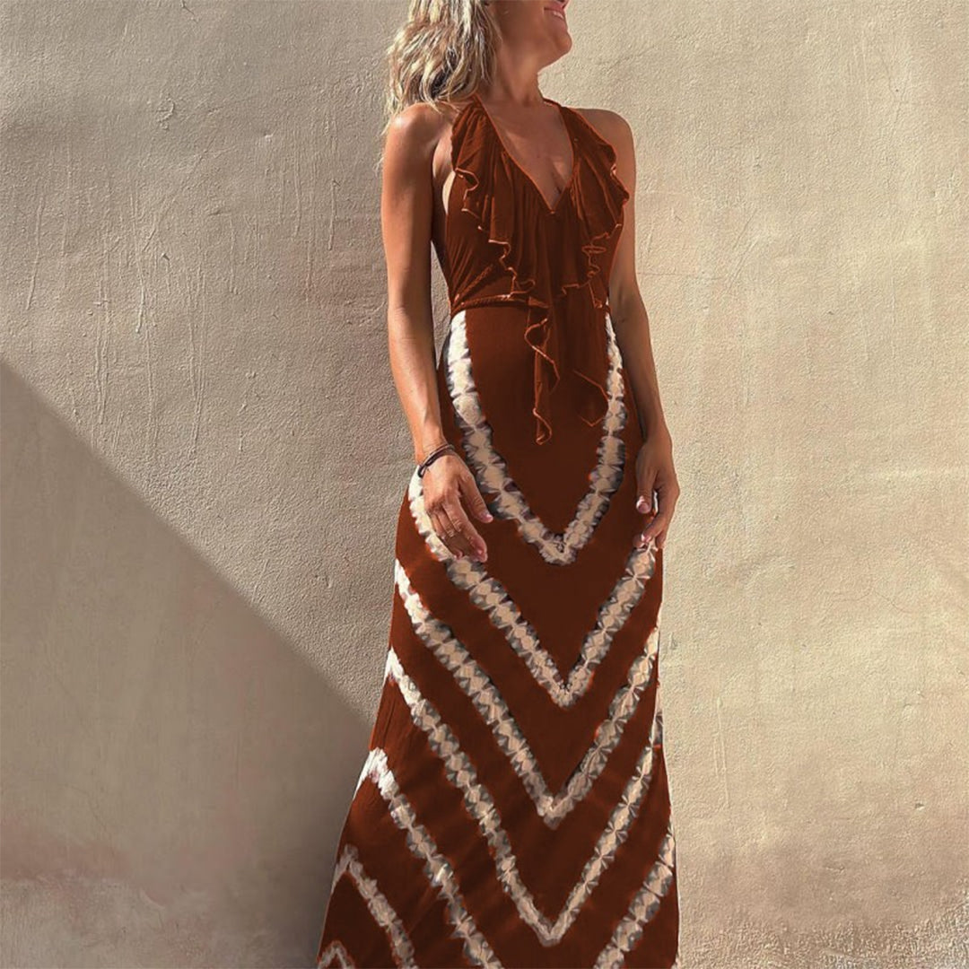 Combineer de Chevron Stripes Maxi Dress met sandalen en een clutch voor een elegante zomerlook. Voeg een denim jacket toe voor een casual twist. Perfect voor bruiloften, avonddiners of een luxe vakantie-uitje.