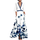 De Elegant Bloom Dress straalt klasse en verfijning uit met haar vloeiende maxi-lengte en prachtige bloemenprint. De diepe V-hals met contrasterende bies en de elegante driekwartmouwen zorgen voor een stijlvol silhouet, terwijl de luchtige stof comfortabel en flatterend valt. Perfect voor speciale gelegenheden of een chique zomerdag.