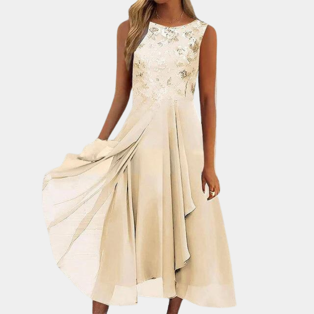 De Elvira Chiffon Dress straalt pure verfijning uit met haar geborduurde bovenlijfje en speelse, asymmetrisch gelaagde rok. Deze mouwloze midi-jurk combineert luchtigheid en elegantie, waardoor ze perfect is voor feestelijke gelegenheden of een chique zomerevent. De zachte chiffon beweegt sierlijk mee bij elke stap.