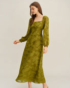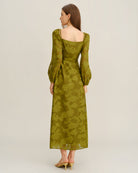 Olive Bloom Dress | Jacquard Midi | Vierkante Halslijn