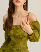 De Olive Bloom Dress is een verfijnde midi-jurk met een romantische uitstraling. Het olijfgroene jacquardpatroon geeft diepte en elegantie, terwijl de vierkante halslijn en lange ballonmouwen zorgen voor een tijdloos silhouet. Perfect voor herfstige dagen, diners of een stijlvolle daguitstap.