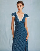 De Riviera Dot Dress is een romantische knipoog naar vintage zomerstijlen. Deze luchtige maxi-jurk in diepblauw met witte stippen heeft een elegante V-hals die is afgewerkt met contrasterend kanten bieswerk. De licht uitlopende rok en korte kapmouwtjes geven een flatterende, vrouwelijke vorm die zowel charmant als comfortabel aanvoelt.