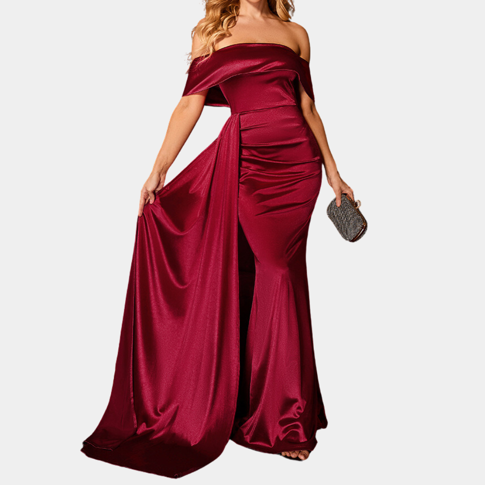 Scarlet Luxe Gown | Off-Shoulder Satijn | Glamoureuze Split & Sleep