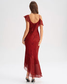 De Scarlet Romance Gown is een betoverende avondjurk die vrouwelijkheid en elegantie perfect belichaamt. De diepe rode tint en transparante tulelaag met verfijnd borduurwerk creëren een romantische, luxueuze uitstraling. De off-shoulder ruches en diepe V-halslijn accentueren het decolleté op sierlijke wijze, terwijl de licht uitlopende rok een elegante beweging toevoegt.