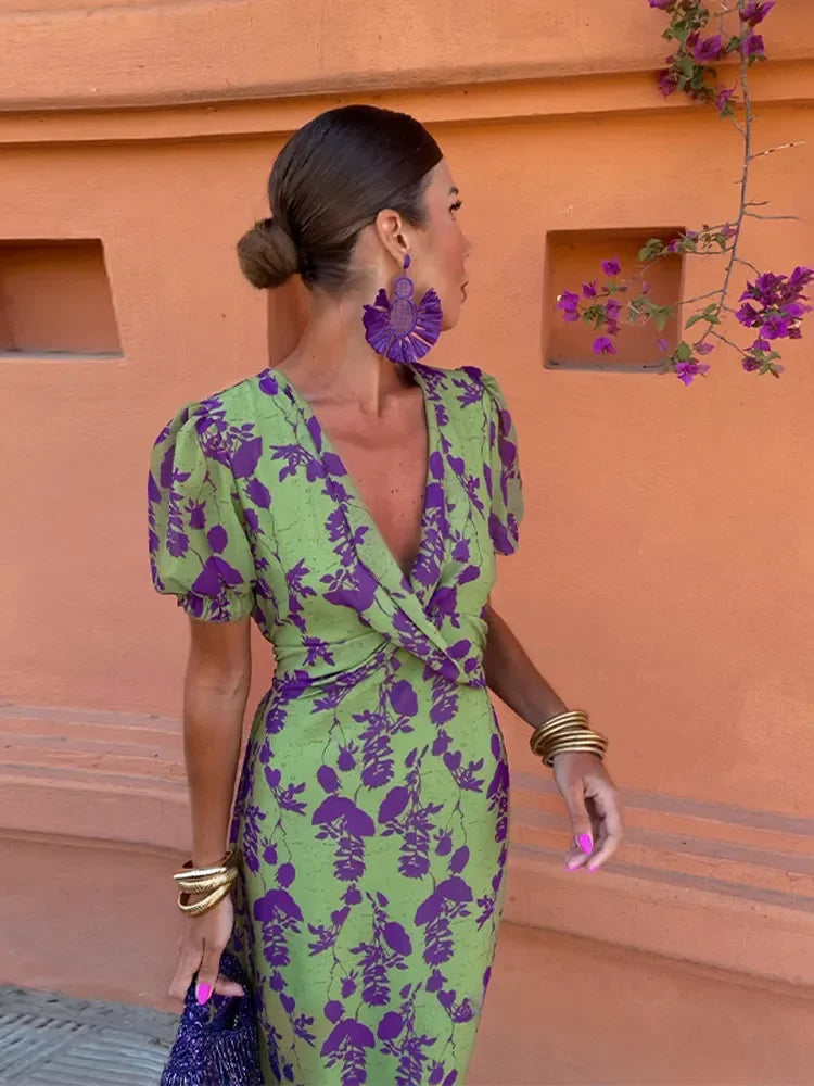 De Zahra Maxi Dress is een elegante en expressieve wikkeljurk die zomerse charme uitstraalt. De prachtige paarse bloemenprint op een olijfgroene basis zorgt voor een opvallende, exotische look. Met haar flatterende V-hals, strikceintuur in de taille en vloeiend vallende maxi-lengte is deze jurk perfect voor warme dagen, stijlvolle avonden of een vakantie vol flair.