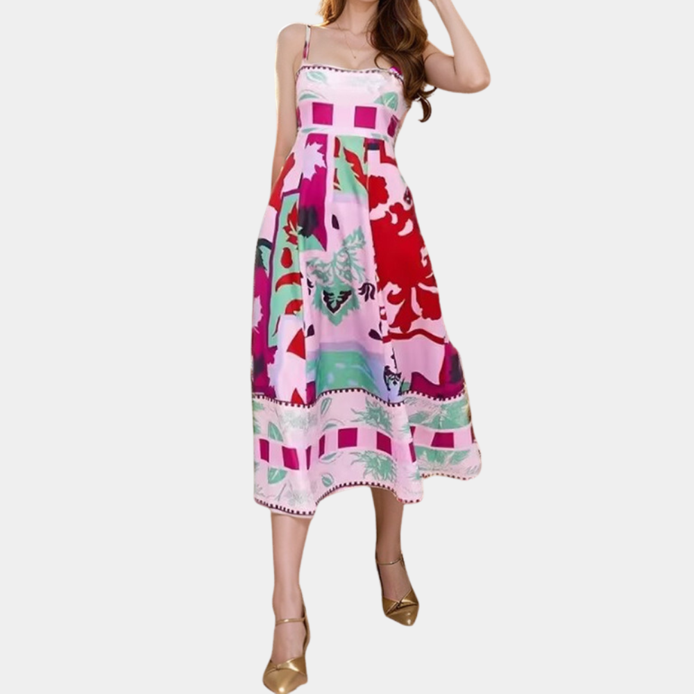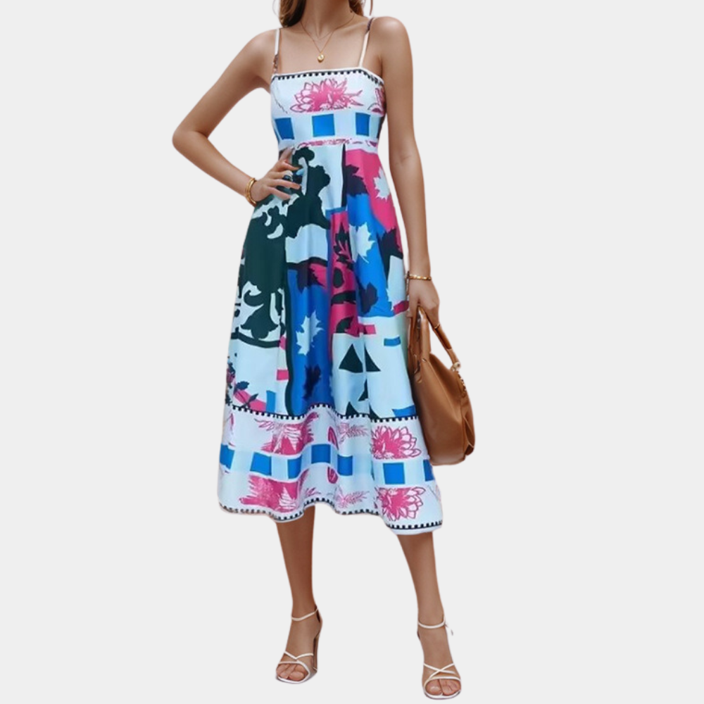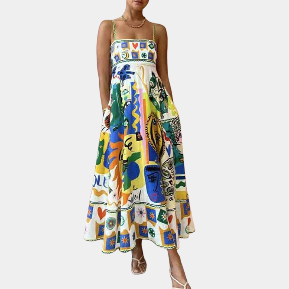 Draag de Arty Jurk met sleehakken en grote oorbellen voor een statement look. Voeg een zonnehoed en een kleurrijke handtas