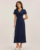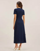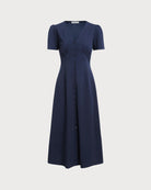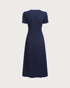 Elise Dress | Knoopdetail & V-Hals | Diepblauwe Elegantie