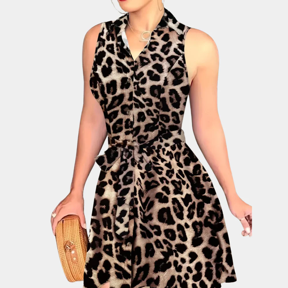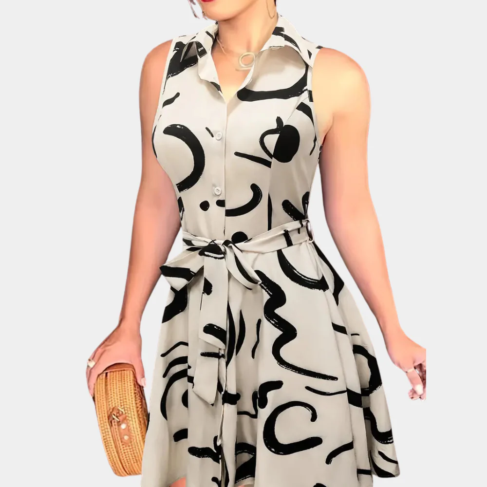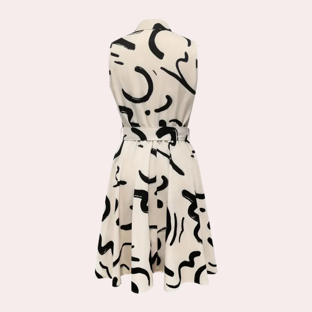 De Gala Jurk is een stijlvolle blikvanger met een verfijnde uitstraling. Deze mouwloze jurk met kraag combineert een flatterende A-lijn pasvorm met een opvallende abstracte print, wat zorgt voor een moderne en artistieke look. Dankzij de bijpassende strikceintuur accentueert de jurk elegant de taille. Perfect voor zomerse dagen, creatieve bijeenkomsten of een chique avondje uit.