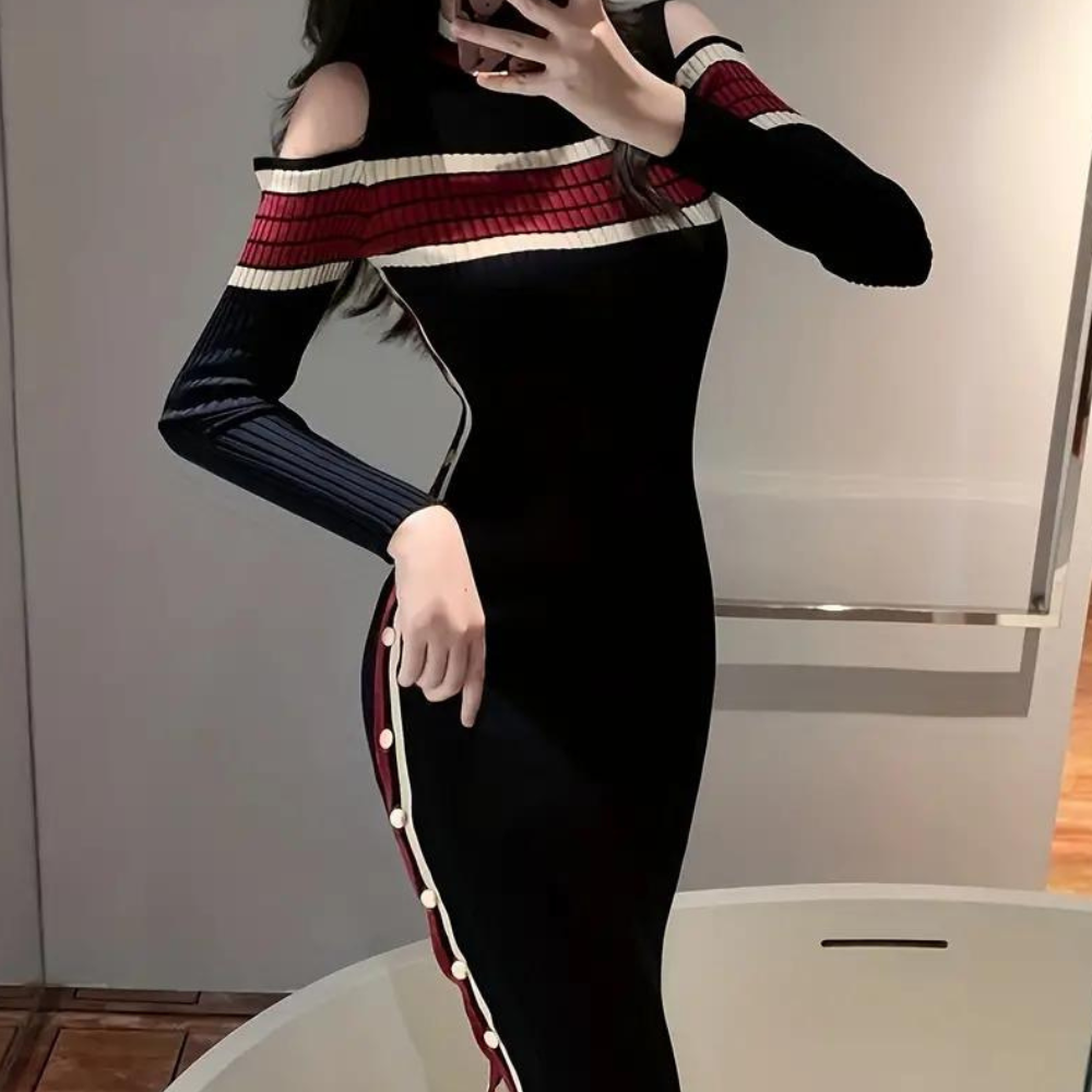 Lyna Jurk | Gebreid Bodycon | Cut-Out Schouder & Sportieve Strepen