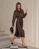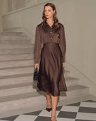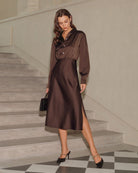 Midnight Mocha Jurk | Satijnen Midi | Glanzende Chic
