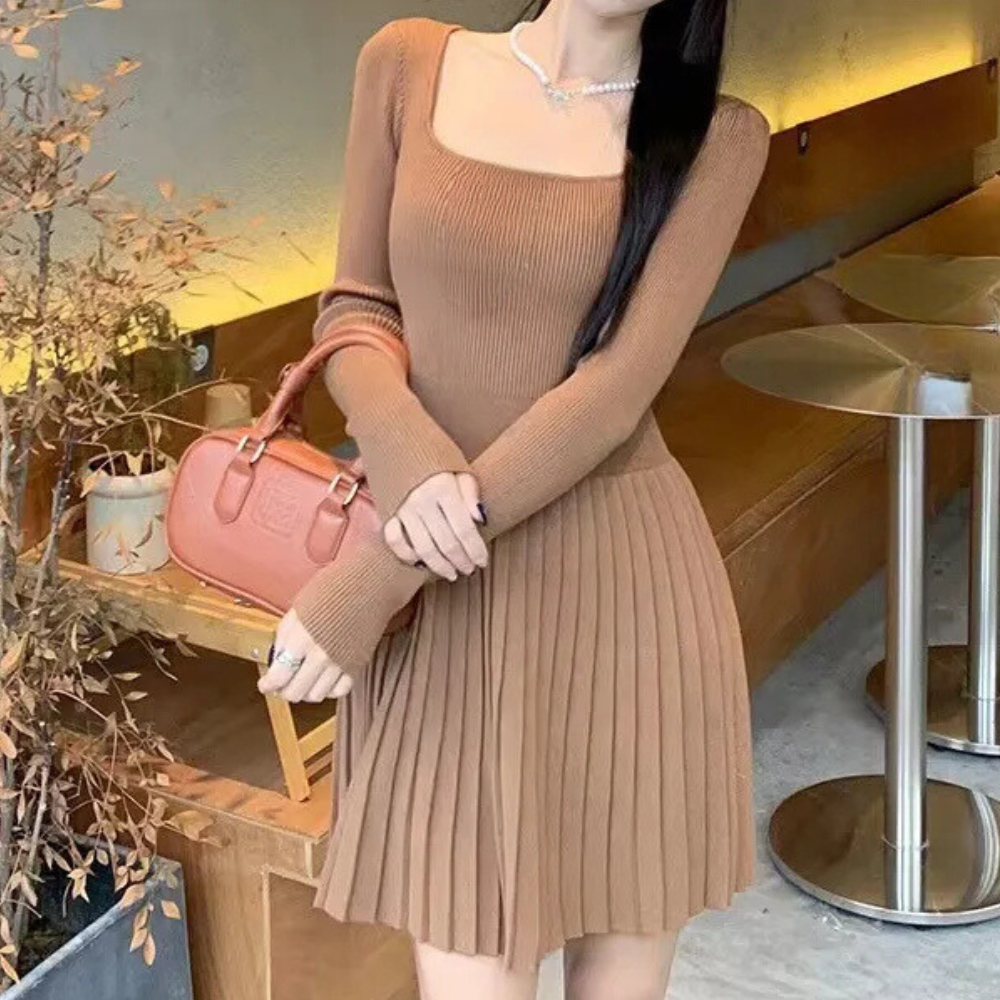 Mocha Pleat Dress | Vierkante Halslijn | Gebreide Elegantie