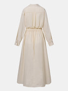 De Modern Grace Hemdjurk is een toonbeeld van ingetogen elegantie. Met haar gestructureerde kraag, lange mouwen en wijd uitlopende rok biedt deze jurk een verfijnd silhouet dat zowel klassiek als eigentijds aanvoelt. De ceintuur in de taille accentueert het figuur, terwijl de zachte glans van de stof een luxueuze touch toevoegt. Perfect voor formele settings of stijlvolle dagmomenten.
