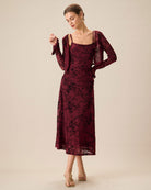 De Ruby Lace Midi Dress is pure romantiek in een luxueuze uitvoering. Deze wijnrode jurk combineert een vrouwelijke vierkante halslijn met delicate kanten details en semi-transparante mouwen. De licht aansluitende pasvorm en vloeiende midi-lengte zorgen voor een elegant silhouet dat moeiteloos allure en verfijning uitstraalt – perfect voor diners, feesten of speciale gelegenheden.
