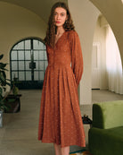 De Rusty Dots Jurk straalt een warme, vrouwelijke charme uit met haar roestkleurige basis en verfijnde stippenprint. Deze midi-jurk met lange mouwen en een zachte V-hals heeft een licht getailleerde pasvorm en een zwierige rok die soepel meebeweegt. De plooitjes aan de taille en knoopsluiting aan de voorkant geven een vleugje vintage flair, ideaal voor elke dag met een bohemian twist.