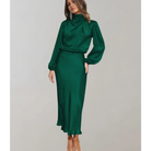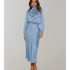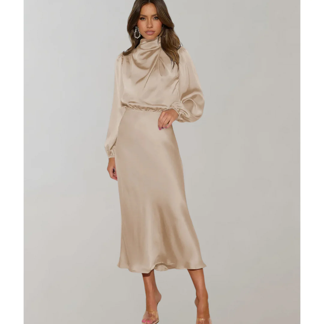Satin Drape Jurk | Luxe Satijnglans | Hoge Hals & Midi-Lengte