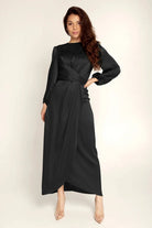 Draag de Satin Drape Jurk met hakken en een clutch voor een elegante avondlook. Voeg subtiele oorbellen toe en draag het haar opgestoken om de halslijn te accentueren. Perfect voor bruiloften, diners of formele events.