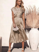 De Silky Elegance Dress is een verfijnde toevoeging aan je garderobe, perfect voor stijlvolle momenten. De glanzende satijnlook en vloeiende midaxi-lengte creëren een vrouwelijke en elegante uitstraling. De licht geplooide taille en kapmouwtjes zorgen voor een flatterend silhouet met een romantische touch.