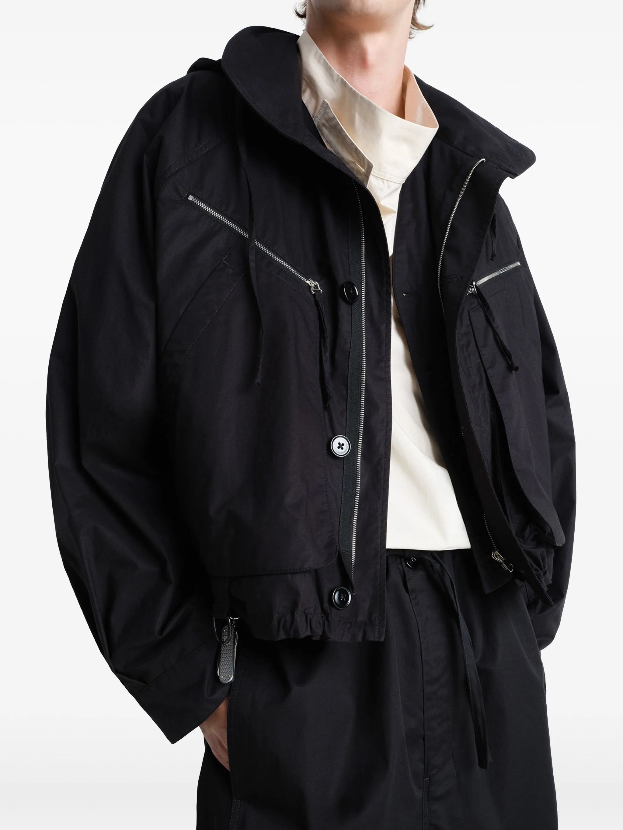 Details: Capuchon met koord, 2 ritszakken op de borst, verstelbare taille, ventilatie flap op de rug