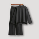 Deze set bestaat uit een comfortabel topje met lange mouwen en bijpassende broek. De snit is losjes en zorgt voor een comfortabele pasvorm met veel bewegingsvrijheid. Het materiaal is zacht en zorgt voor een comfortabele pasvorm. Ideaal voor een ontspannen dag of gewoon thuis.