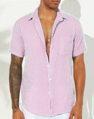 Dit overhemd is een ware eyecatcher dankzij de diepe V-hals, speelse verticale strepen en luchtige stof. De relaxte pasvorm en lichte materialen maken het ideaal voor warme dagen, terwijl de open kraag zorgt voor een sensuele en gedurfde uitstraling. Draag het losjes of met een paar knopen dicht – het straalt moeiteloos vakantiegevoel en zelfvertrouwen uit. Verkrijgbaar in frisse pastel- en neutrale tinten zoals grijs, roze, groen en blauw.