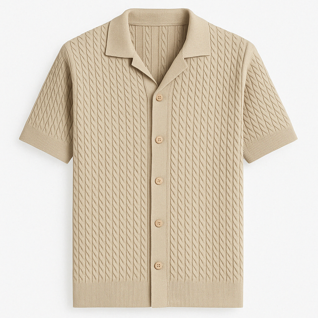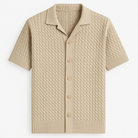 Deze beige gebreide polo met korte mouwen is precies wat je zoekt. Met zijn zachte textuur, klassieke kabelpatroon en open kraag straalt hij een verfijnde maar relaxte vibe uit. Perfect voor warme dagen waarop je er verzorgd uit wilt zien met minimale moeite.