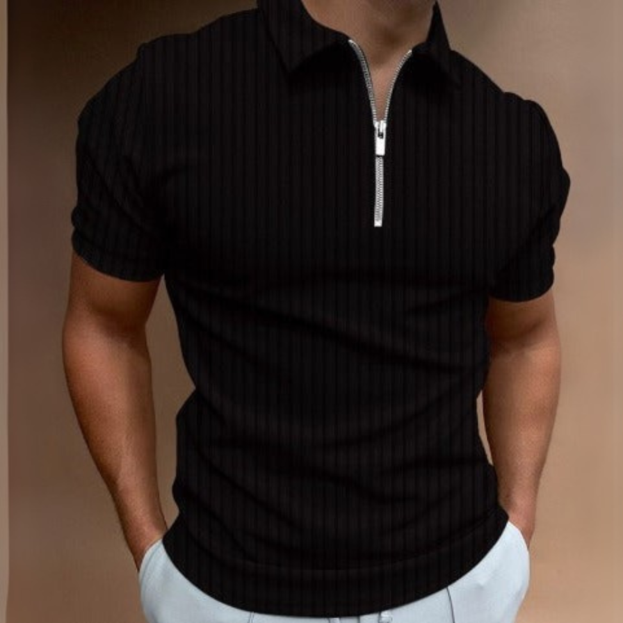 Deze slim fit polo is gemaakt van een zachte, gebreide stof met verticale textuur die zorgt voor een subtiel gestroomlijnd effect. De korte mouwen en moderne ritssluiting in plaats van traditionele knopen geven het een sportieve, eigentijdse twist. Perfect voor smart casual gelegenheden of een stijlvolle zomerdag. Verkrijgbaar in neutrale tinten zoals zwart, lichtblauw, beige en wit.