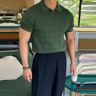 Met zijn verfijnde kabelstructuur en zachte, rekbare stof is deze gebreide polo een stijlvolle keuze voor zowel dagelijkse looks als semi-formele gelegenheden. De open kraag zonder knopen geeft een relaxte uitstraling, terwijl de aansluitende pasvorm je silhouet accentueert. Verkrijgbaar in klassiek groen, wit en zwart, past deze polo moeiteloos in elke moderne garderobe. Het subtiel textuurdesign geeft extra diepte aan je outfit, terwijl de korte mouwen zorgen voor luchtigheid op warme dagen.