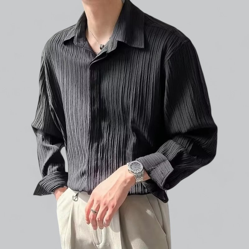 Dit herenoverhemd is gemaakt van een lichte, ademende stof met een verfijnde verticale streepstructuur voor een moderne twist. De losvallende pasvorm zorgt voor comfort en een relaxed silhouet, terwijl de klassieke kraag en knoopsluiting het geheel een minimalistische elegantie geven. Ideaal voor zowel casual dagen als smart casual settings.
