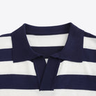 • Design: Brede strepen in navy/off-white + split kraag zonder knopen